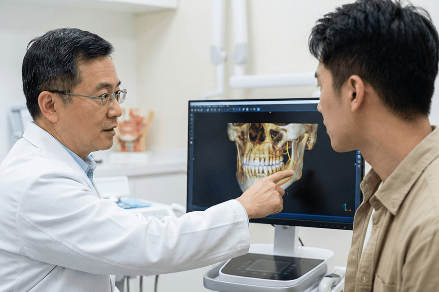 「曾有病患在他院被評估可直接植牙,但經CT檢查後,發現下齒槽神經位置異常、緊鄰植牙區。若未事前發現,極可能造成永久性麻木。因為CT的提前評估,我們調整植牙角度與長度,成功避開神經,術後完全沒有神經不適。」