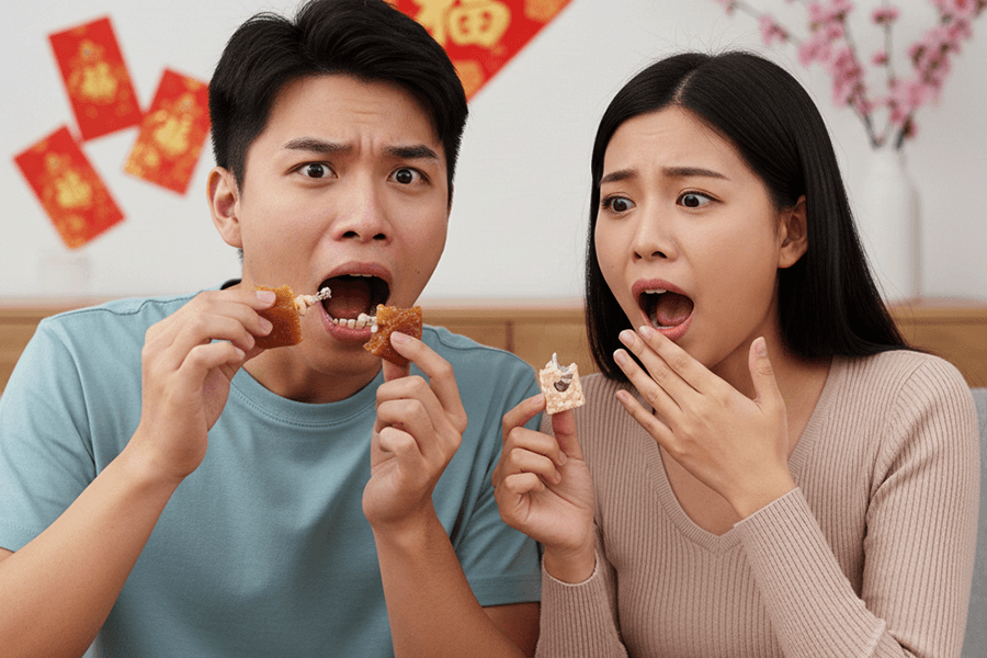 過年少不了象徵步步高升的年糕,或是奶香濃郁的牛軋糖。這類食物的特質就是「又黏又硬」。對於配戴假牙、牙橋或是有補牙的患者來說,這簡直是口腔裡的拔河比賽。